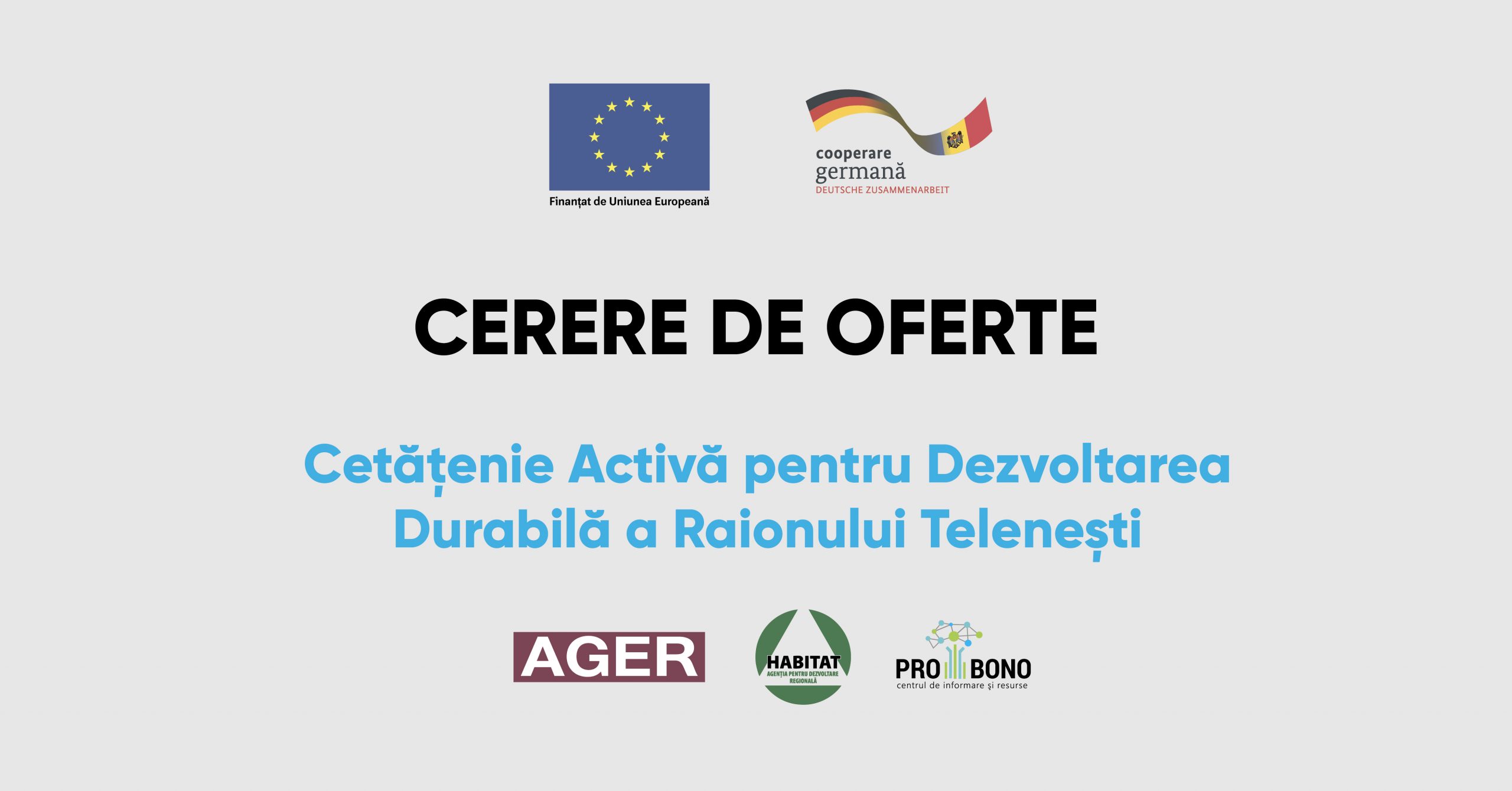 UE // Centrul de Informare și Resurse „Pro Bono” anunță concurs de selectare a unei companii care va fi responsabilă de imprimarea materialelor promoționale, în cadrul proiectului „Cetățenie activă pentru Dezvoltarea Durabilă a raionului Telenești”, beneficiar al programului de granturi „Fii schimbarea: Cetățeni implicați – comunități durabile”, parte a proiectului „Abilitarea cetățenilor în Republica Moldova”, finanțat de Uniunea Europeană și implementat de Agenția de Cooperare Internațională a Germaniei (GIZ).